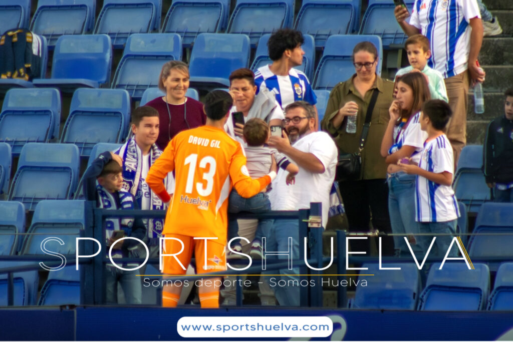David Gil, con la afición tras el partido. / Iván Vargas / SportsHuelva