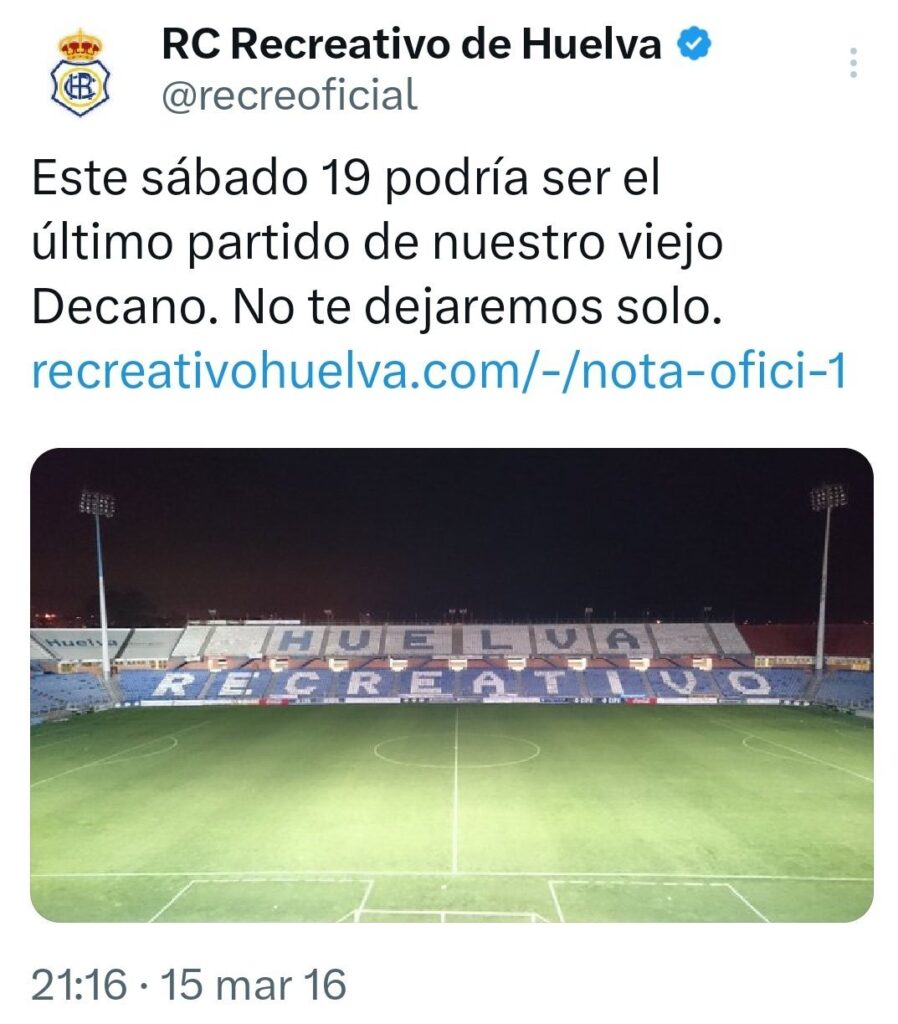 Hace una década, el Recreativo de Huelva publicó un mensaje en sus redes sociales que encendió todas las alarmas: “Este sábado 19 podría ser el último partido de nuestro viejo Decano”. No fue una campaña publicitaria, sino un grito de auxilio ante el inminente riesgo de ver desaparecer sus 127 años de historia. Las deudas acumuladas y un escenario institucional asfixiante habían dejado al equipo contra las cuerdas, convirtiendo la amenaza de disolución en una posibilidad muy real.