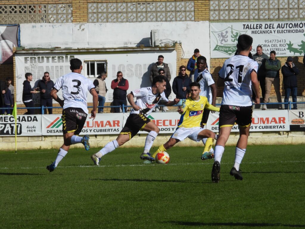 El conjunto aurinegro cae por la mínima ante el Coria y se queda a cuatro puntos del play-off de ascenso