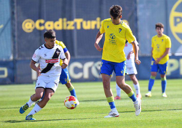 El conjunto dirigido por Cheli introdujo una única variación respecto al último compromiso liguero, dando entrada a Cheikh en lugar de Rubén García. Desde el inicio, el filial cadista imprimió un ritmo alto, generando peligro constante sobre la portería defendida por Santi Maidana, que pronto comenzó a erigirse como protagonista.