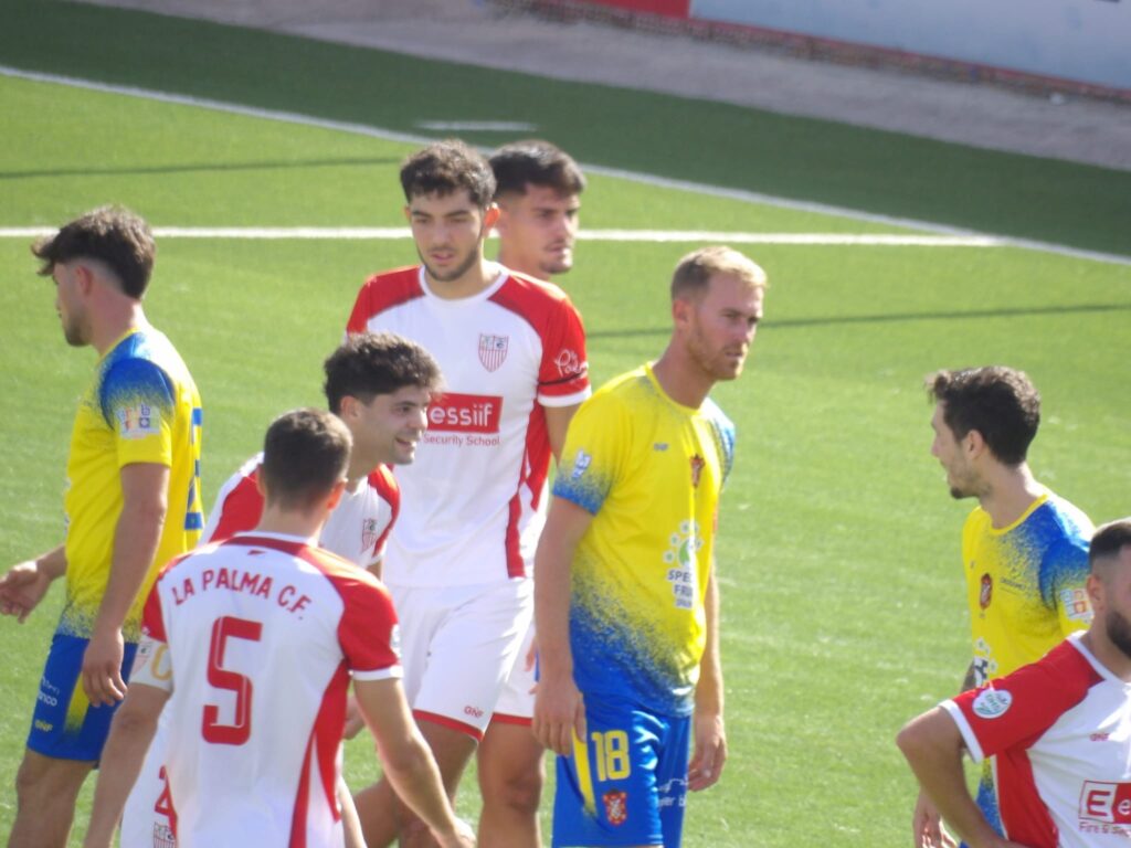 El choque comenzó con La Palma CF llevando la iniciativa, intentando encontrar espacios ante un Moguer bien plantado en defensa. Los primeros avisos llegaron con disparos de Manu Torres y Álex Márquez, que se marcharon por encima del travesaño. Los amarillos aprovecharon su ocasión más clara en el minuto 23, cuando Akram puso un centro medido que Víctor Sánchez cabeceó a la red para adelantar al conjunto moguereño. Sin embargo, la alegría visitante duró poco: apenas cinco minutos después, Hugo Díaz empató el duelo tras una buena jugada por banda de Belchi, que culminó el delantero palmerino en segunda instancia para establecer el 1-1.